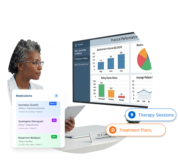 Within Medinous, Behavioral Health workflows are embedded in the broader hospital and clinic management platform — connecting intake, assessments, therapy encounters, care plans, referrals, pharmacy coordination, structured outcomes tracking, and revenue cycle workflows. This helps reduce documentation burden, improve clinical consistency, strengthen compliance, and provide operational visibility for program leaders.